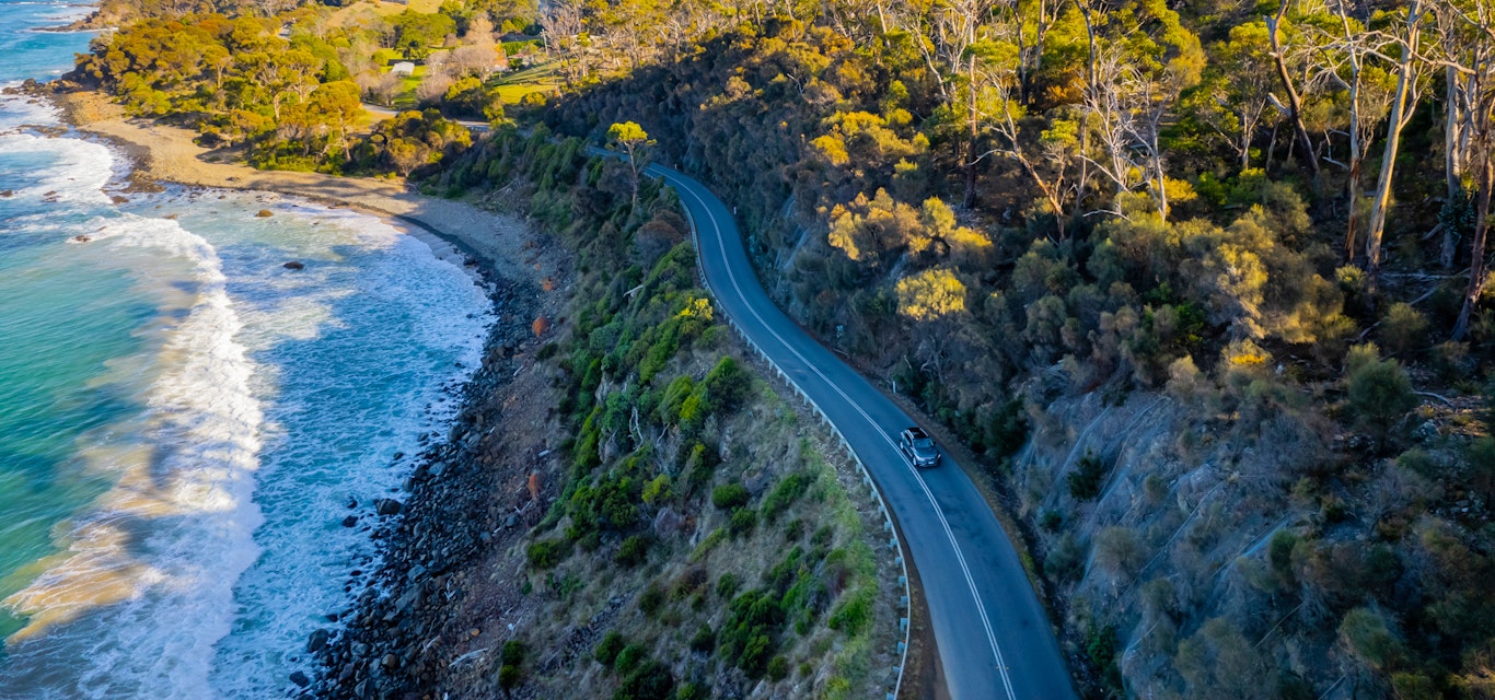 This is a stretch of coastline where the Great Eastern Drive is unquestionably great, swooping down off the hills to Kelvedon Beach and the loneliest and most picturesque boat shed in the state. I park the car and wander out onto the beach, scanning the flat bay for whales, which are often seen in Great Oyster Bay as they make their springtime migration towards Antarctic waters. This day, the sea is empty but the sky is full, with a wedge-tailed eagle circling gracefully overhead. Across the bay, the peaks of Freycinet and Schouten Island seem to grow out of the sea, with smaller islands running off the southern tip of Schouten like stepping stones into the Tasman Sea.